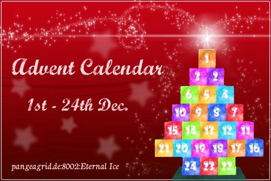 Der jährliche Adventskalender Von heute an bis zum 24. Dezember gibt es wieder jeden Tag kleine Geschenke zum Abgreifen für alle, die die Adventskalender-Tradition genauso lieben wie ich ![]() Alle Geschenke bleiben über ihr eigentliches Datum hinaus erhältlich, so dass kein Stress mit täglichen Besuchen der Region Eternal Ice entstehen muss ![]() Die Vorweihnachtszeit ist für viele im realen Leben schon aufreibend genug, da können wir es in der virtuellen Welt etwas gelassener angehen ![]() Eine schöne Adventszeit wünscht euch Bink Draconia Taxi: pangeagrid.de:8002:Eternal Ice |