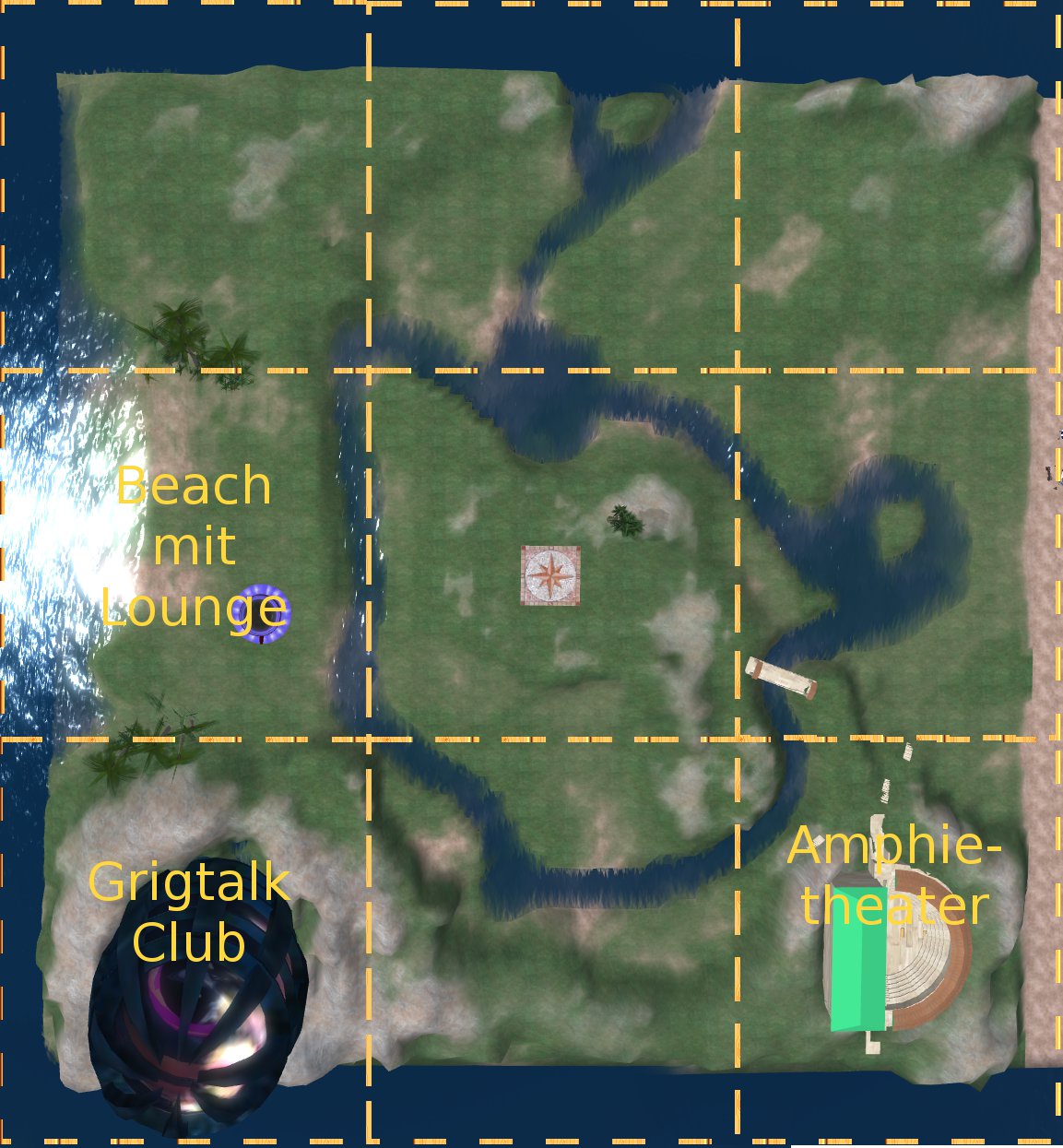 Der Stand der Dinge: Es wird ein Hochplateau in Form einer Windrose als zentralen Landeplatz geben, dort werden ein Info-Center und ein Teleport-Center untergebracht werden. Von dem Hochplateau gegen verschiedene Täler ab, die für unterschiedliche Zwecke genutzt werden. So z.B. kleine Amphie-Theater für Schulungen und Lesungen. Ein Teil wird anderen Grids zur Verfügung stehen, dort Projekte vorzustellen, Maretas Vorschlag folgend. So lange sie nicht genutzt bzw. angefordert werden, gibt es dort Grünanlagen. Für größere Musikveranstaltungen, Tanzereien, wird es auf dem Hochplateau einen Club geben.