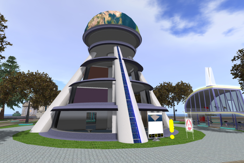 Meine Rundreise durchs Metropolis Metaversum möchte ich da beginnen, wo man normalerweise als erstes landet: auf der Welcome-Sim. Metro hat eine der ganz wenigen, wo man nicht auf plattem Land landet. Dieser spektakuläre Bau ist eine Kreation von Pixel Prim mit vier Stockwerken.