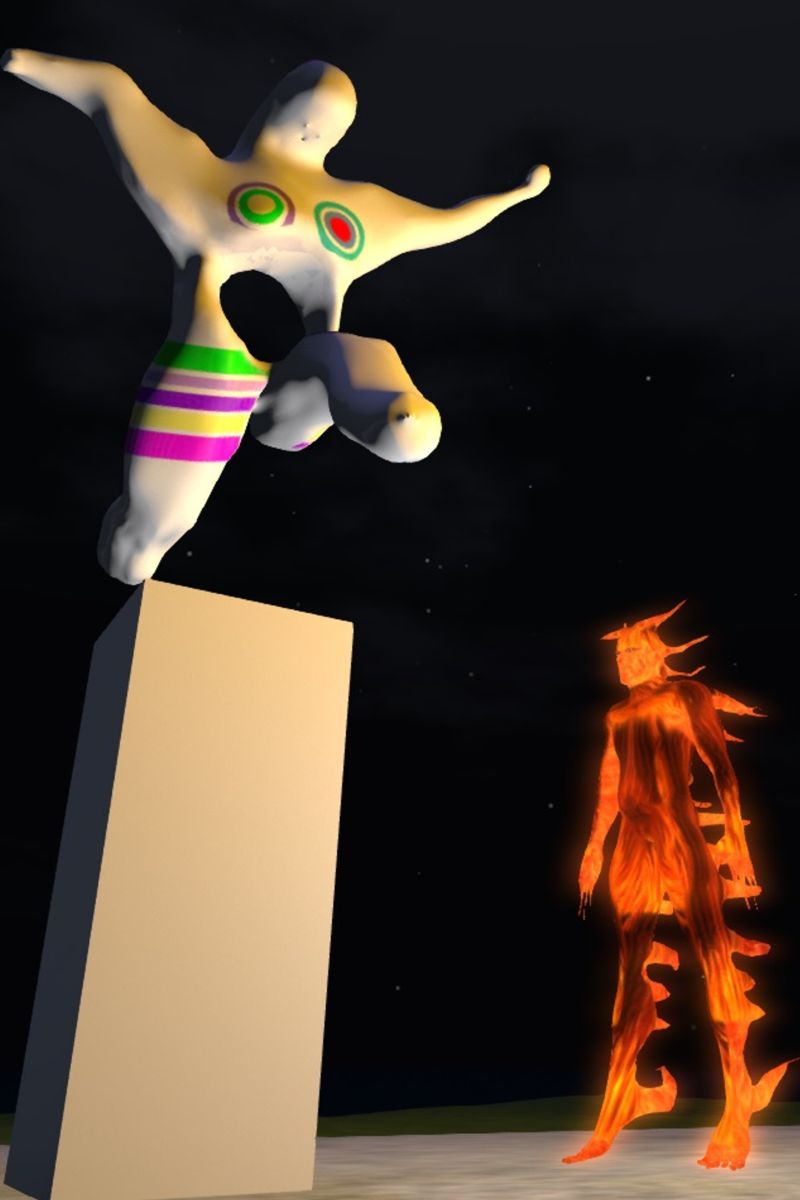 Nana oder Henry Moore? Titel: "Die Angst des Tormanns vorm Elfmeter". Nagut, ich geb zu: sieht eher aus wie ein Knetemännchen. Aber kann ja noch werden... (ich übe gerade mit Blender, also ich ÜBE, nicht immer erfolgreich). Der Beleuchter daneben ist "Fireman", auch hier naja (eigentlich wollte ich Bogus' Halloweenavatar nachbauen, aber es ist was anderes dabei rausgekommen, sowas wie ne glühende Kohle)