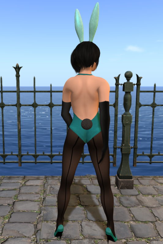 So hat sie gestern Ostereier im Alternate Metaverse gesucht. Im Prinzip wie gehabt, jetzt aber mit Stiefeln mit eingebauten Legwarmers von LyAvain Swansong. Zwischendurch hat sie sich in Erwartung eines Event noch einmal umgezogen. Die Pumps sind von Klara, Juno hat sie eingefärbt, genau wie die nun dunkle Blume. Die Strumpfhose ist auch wie gehabt, aber eine dunklere Variante. Die Handschuhe sind aus Victoria Clarys Bunny-Outfit, womit Juno sich schon beim dritten Bunny-Outfit bedient hat.