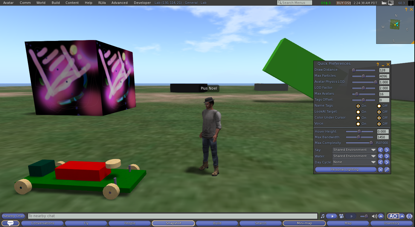 Was ich vermisse sind Wolken! Huh Die Defaultwolken, die bisher durch den Himmel zogen, sind weg! Und zumindest auf Dereos wird bei "shared environment" eine ganz seltsame Tageszeit erzeugt: Mit Sonne, Mond und Sternen gleichzeitig. Folge unbrauchbares Licht.
