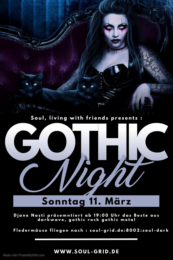 Sonntag den 11.04.2021 ab 19 Uhr donnert Euch Nasti das Beste aus der Welt der dunklen Musik um die Ohren. Das Event findet auf der Region "Soul-Dark" statt. Route für die Fledermäuse : soul-grid.de:8002:soul-dark Wir freuen uns auf Euren Besuch
