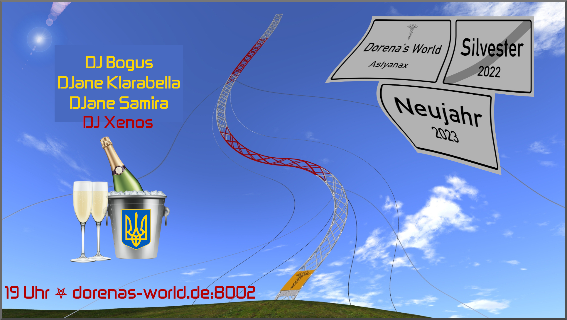 Liebe Freunde, und schon wieder haben wir ein Jahr geschafft. Damit das neue Jahr feuchtfröhlich gestartet werden kann, veranstalten wir eine große Silvesterparty in Dorena's World. Ab 19 Uhr möchten wir mit euch ins Jahr 2023 hinüberrutschen. Ihr seid herzlich dazu eingeladen, am 31. Dezember mit uns anzustoßen.