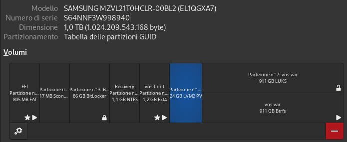 Man beachte die vergrößerte EFI-Partition, die sich nun Windows und Vanilla OS teilen müssen. Secure Boot ist bei mir aktiv, und die Datenpartitionen beider Betriebssysteme sind verschlüsselt (weil man Notebooks auch mal verlieren kann).