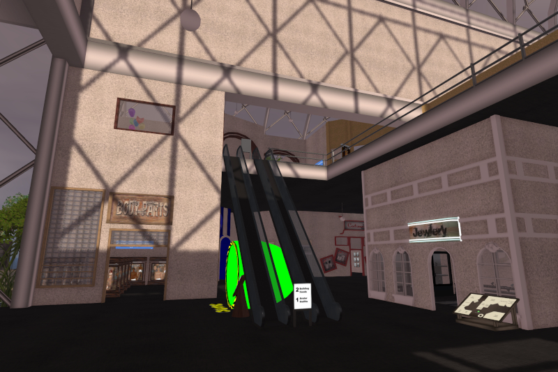 Aber irgendwas ist hier anders. Rolltreppen? Ein zweites Stockwerk? Tja, das hier dürfte noch die erste Version von Lindas Mall gewesen sein, bevor sie der Übersichtlichkeit halber das obere Stockwerk entfernte, einen eigenen Anbau für Möbel dranflickte und leider auch einen nicht unerheblichen Teil des Sortiments rauswarf. Die normalerweise einzeln angebotenen Haare und Augen gibt's hier nicht mal mehr in Sammelkisten. Das grüne Etwas ist übrigens Neovos Vorstellung von einem Fotostudio mit einfarbigem Hintergrund.