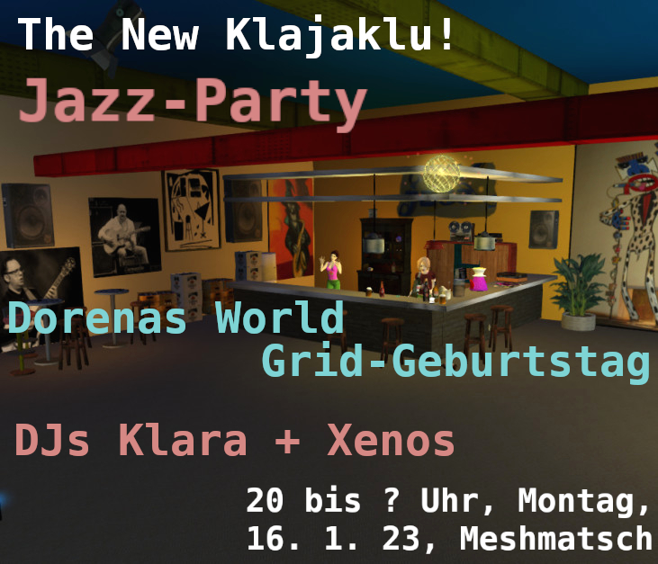RE: Blue Monday im Klajaklu - Xenos Yifu - 12.01.2023 Wir kommen zu nix mehr ![]() Mukke und ab gehts.... RE: Blue Monday im Klajaklu - Jupiter Rowland - 12.01.2023 Ein bißchen werde ich die alte Kaschemme wohl vermissen, aber der neue Laden ist sicherlich nicht schon mit drei Tanzpaaren rappelvoll. RE: Blue Monday im Klajaklu - Klarabella Karamell - 14.01.2023 RE: Blue Monday im Klajaklu - Dorena Verne - 17.01.2023 Hier gehts zu den Bildern des Abends: Gridjubiläum #13 RE: Blue Monday im Klajaklu - Klarabella Karamell - 21.01.2023 Is Montach Jazzcub? Ja, Montach, 23. 1. 23, is Jazzclub! Wie immer 20 Uhr bis ich keine Lust mehr hab. Thema? Kein Thema. Gemischter Unfalltod quasi. Klajaklu auf Meshmatsch Dorenas World |