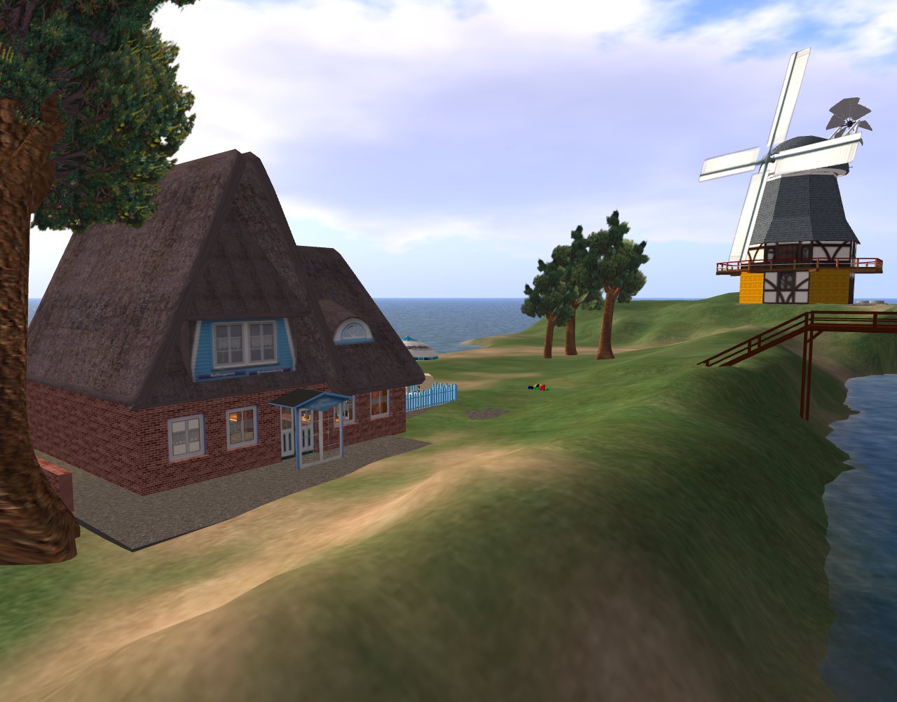 Die Mitte sollte frei bleiben, ähnlich einem Central Park, denn von dort kann man die Sim wunderschön überblicken und in alle Bereiche laufen. Genau in die Mitte der Sim, also der Nullpunkt ziert auf den Boden eine große Windrose, umsäumt mit Grünanlage, Sitzgelegneheiten und Springbrunnen. Wege führen in die entsprechenden Zentren und um die Sim.