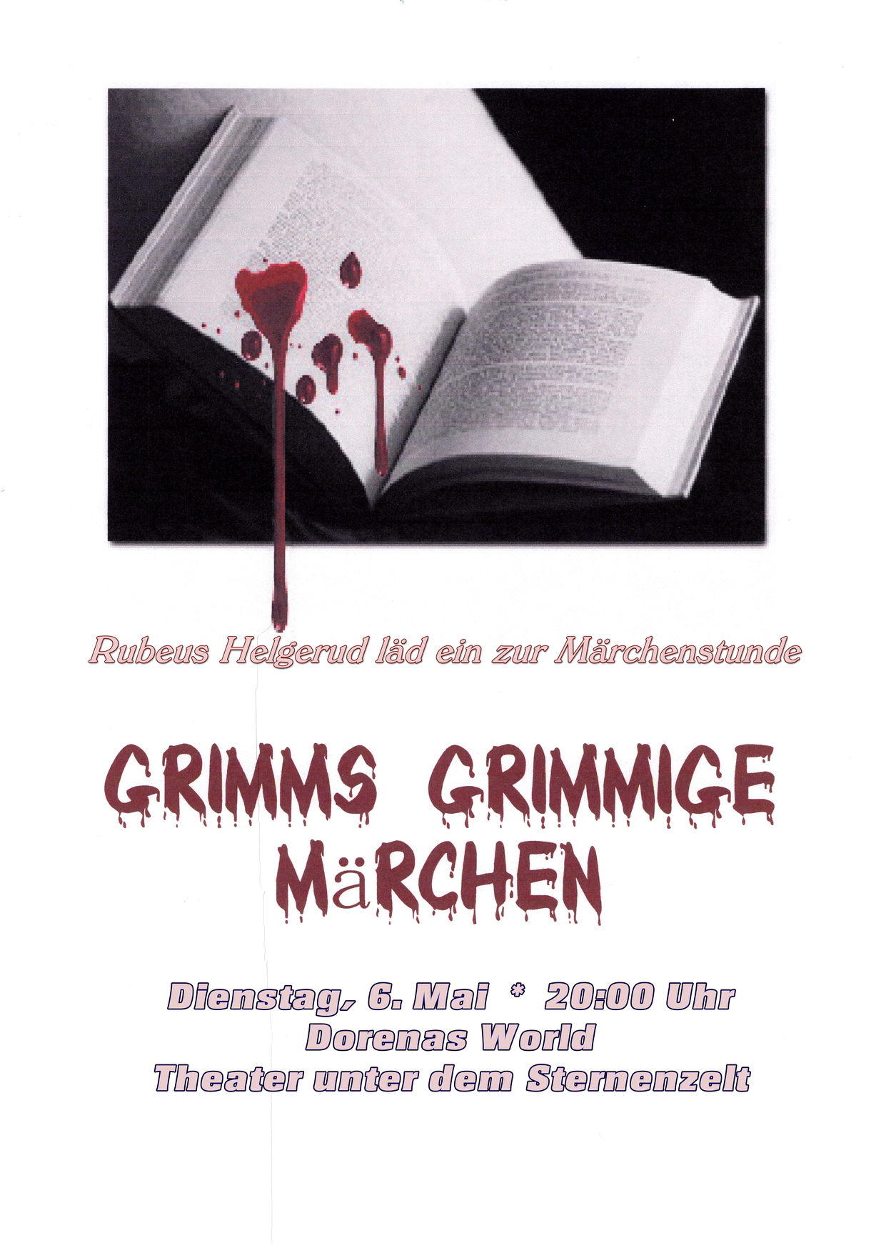 Grimms Grimmige Märchen Dienstaggabend, 20:00 Uhr auf Santas Planets, Theater unter dem Sternenzelt hop://dorenas-world.de:8002/Santas Planets/150/191/823 Den lauen Sommerabend nutzend werden wir kuschelige Märchen der Brüder Grimm zu hören bekommen. Ähm - Kuschelig? Ich wollte natürlich sagen gruselig - denn einige Kurzmärchen der lieben Brüderlein sind eher schon dazu geschaffen, einem bei Sommerhitze die Gänsehaut den Rücken auf. und abfahren zu lassen. Nun dann - lasset uns schauen und grauen...... Nachtrag: Diesesmal schon am ERSTEN Dienstag im Monat weil ich am 13. nicht in meiner heimeligen Hütte daheim bin und dort wo ich bin keinen Zugang auf einen PC haben werde. Ich freu mich auf Euch