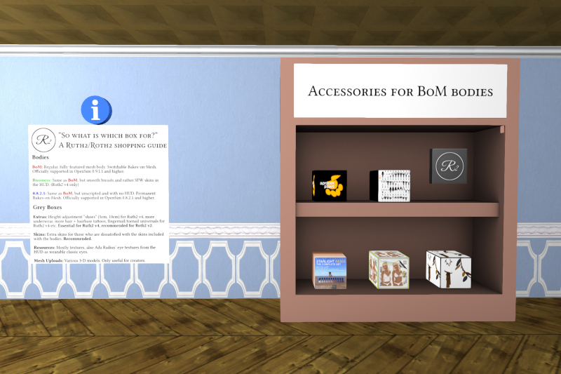 Der Laden führt natürlich die neuen Bake-on-Mesh-Versionen von Roth2 und Ruth2, also Roth2 v2 und als wohl erster Laden außerhalb der RuthAndRoth-Sim überhaupt auch Ruth2 v4. Auch das gesamte Zubehör und Quellmaterial ist dabei.