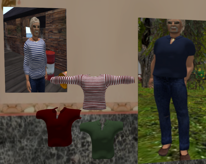 Das bretonische Fischer-Shirt kommt mit 3 Texturen. Streifen in Rot, Blau und Grün. Die Poloshirts sind färbbar. Das eine hat Knöpp, das anner einen längeren Ausschnitt... Man kann nicht alles haben.