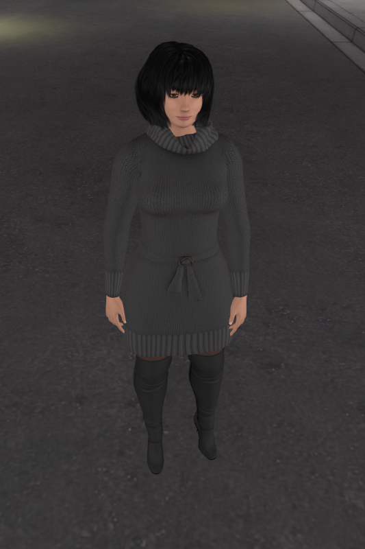 Juno hatte heute eines der alten Sasa-Pulloverkleider von Loru Destiny an; das sollte immer noch in Lorus Laden in Needful Things (pangeagrid.de:8002:Needful Things) zu finden sein (Loru: bitte hängen lassen, die Kleider sind gut). Als Kleid war es Juno aber sogar mit Strumpfhose zu kurz, einmal wegen der Witterung, es ist ja immerhin ein Strickkleid, außerdem zum Tanzen zu heikel. Doch siehe da: Klaras nicht mehr ganz neue Mesh-Hosen passen drunter, hier die gerade geschnittene als Jeans texturiert. Hose und Texturen gibt's auf Bella Klara (dorenas-world.de:8002:Bella Klara), da kann man sich einige Varianten selbst zusammenstellen. Die Stiefel sind reBoot Dune Middle Boots von der dritten Ruth-2.0-Modeschöpferin, Taarna Welles. Die findet man auf ihrer Sim Savvy (bubblesz.nl:8002:Savvy). Ich bin derweil komplett in Taarna-Welles-Sachen eingekleidet inklusive meiner neuen Brille (reMake Urban Glasses, eigentlich eine Sonnenbrille, aber von mir zur normalen Brille umfunktioniert). Die, den Hoodie (reMake Hoodie Men Grey Text) und die Jeans (reMake Jeans Base Black) gibt's auch auf Savvy. Die Sneakers sind noch Sculptie-Schuhe, die LB Furio Black Sneakers; die findet man auf Taarnas alter Sim La Baronnie (bubblesz.nl:8002:La Baronnie).