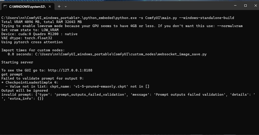 8. run_nvidia_gpu.bat doppelklicken. Es wird eine Konsole geöffnet und der entsprechende Text erscheint, wie im Video dargestellt.