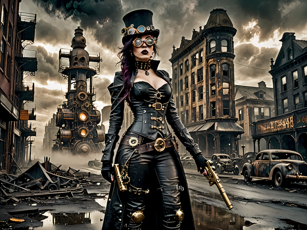 In den Ruinen dessen, was einst eine pulsierende Metropole war, steht Sarah zwischen verstaubten Trümmern. Ihr metallener Brustpanzer glänzt matt im Licht der untergehenden Sonne. Sie hatte gerade ihre tägliche Suche nach Vorräten beendet, als sie in den Überresten einer alten Bibliothek etwas Besonderes entdeckte: ein erstaunlich gut erhaltenes Buch aus dem Jahr 2024.