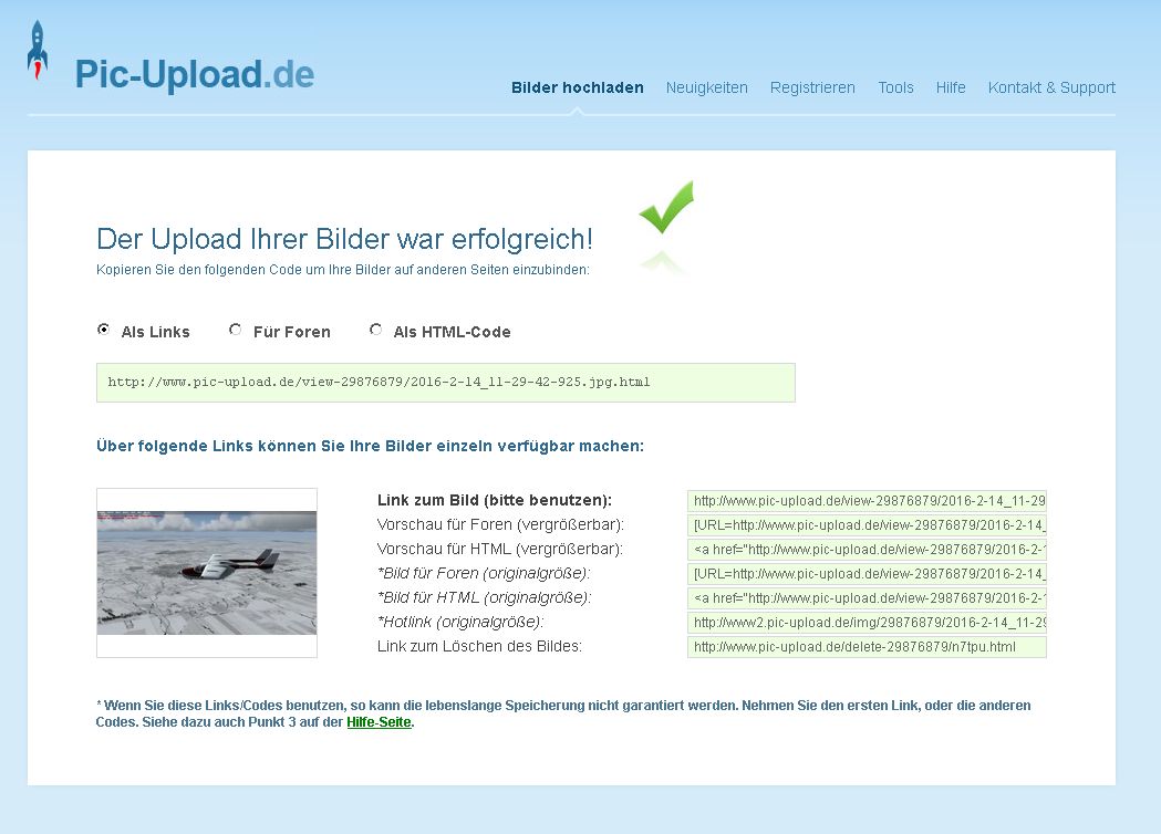 Da müsst ihr *Bild für Foren (originalgröße):" wählen, dann sollte es auch mit dem Bild klappen