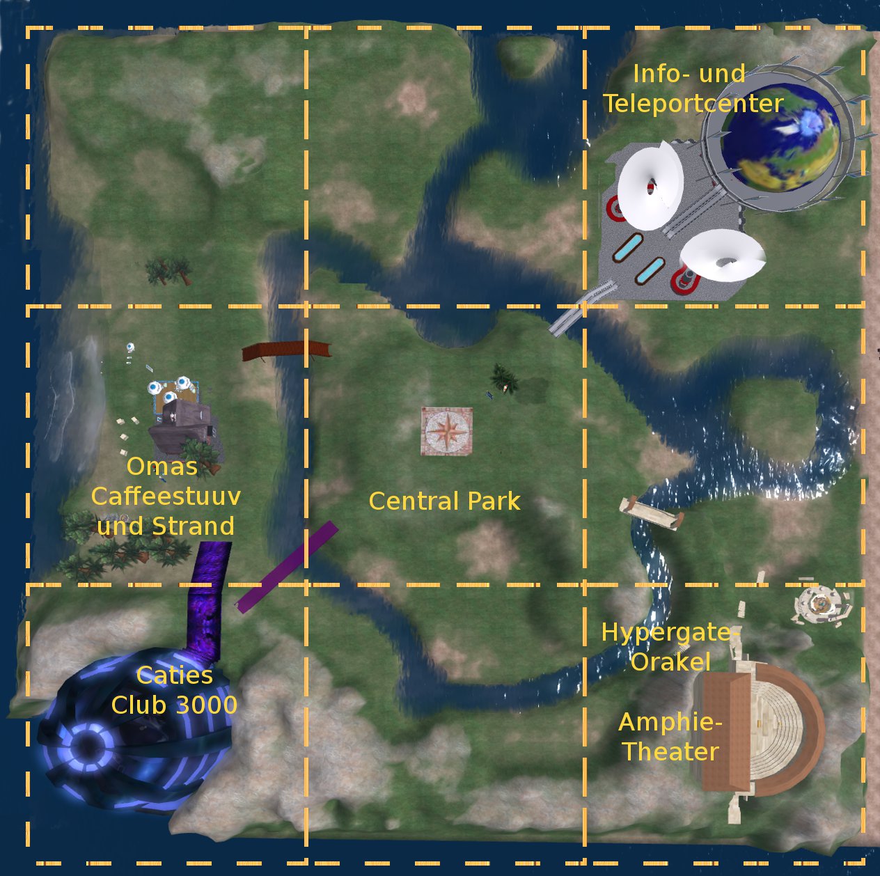 Die Mitte sollte frei bleiben, ähnlich einem Central Park, denn von dort kann man die Sim wunderschön überblicken und in alle Bereiche laufen. Genau in die Mitte der Sim, also der Nullpunkt ziert auf den Boden eine große Windrose, umsäumt mit Grünanlage, Sitzgelegneheiten und Springbrunnen. Wege führen in die entsprechenden Zentren und um die Sim.