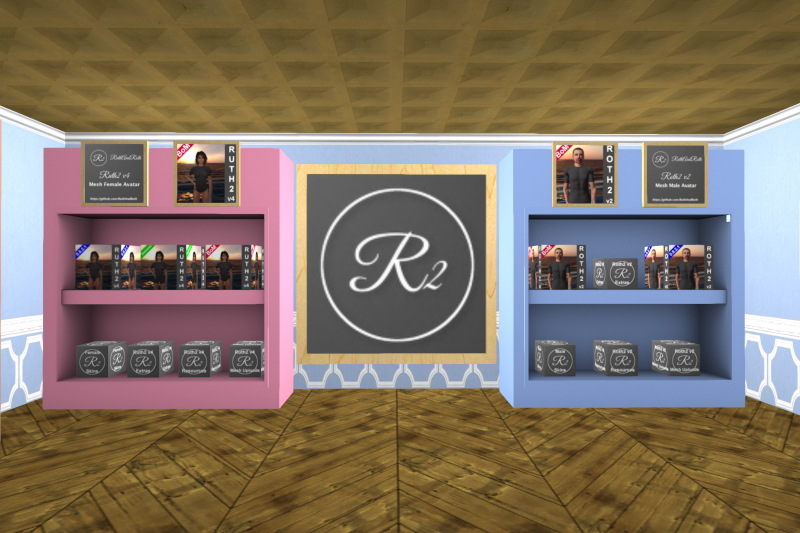 Auf der linken Ladenseite sind die "Legacy-Regale" mit dem Zeug von vor Roth2 v2. Im oberen linken Fach hängen, wohl einmalig im Hypergrid, in chronologischer Reihenfolge Shin Ingens vier Versionen von Ruth 2.0, also der Test Release, der RC#1, der RC#2 und der RC#3. Daneben war noch Platz für Roth 2.0 RC#1, der ja zeitgleich mit Ruth 2.0 RC#3 erschien.
