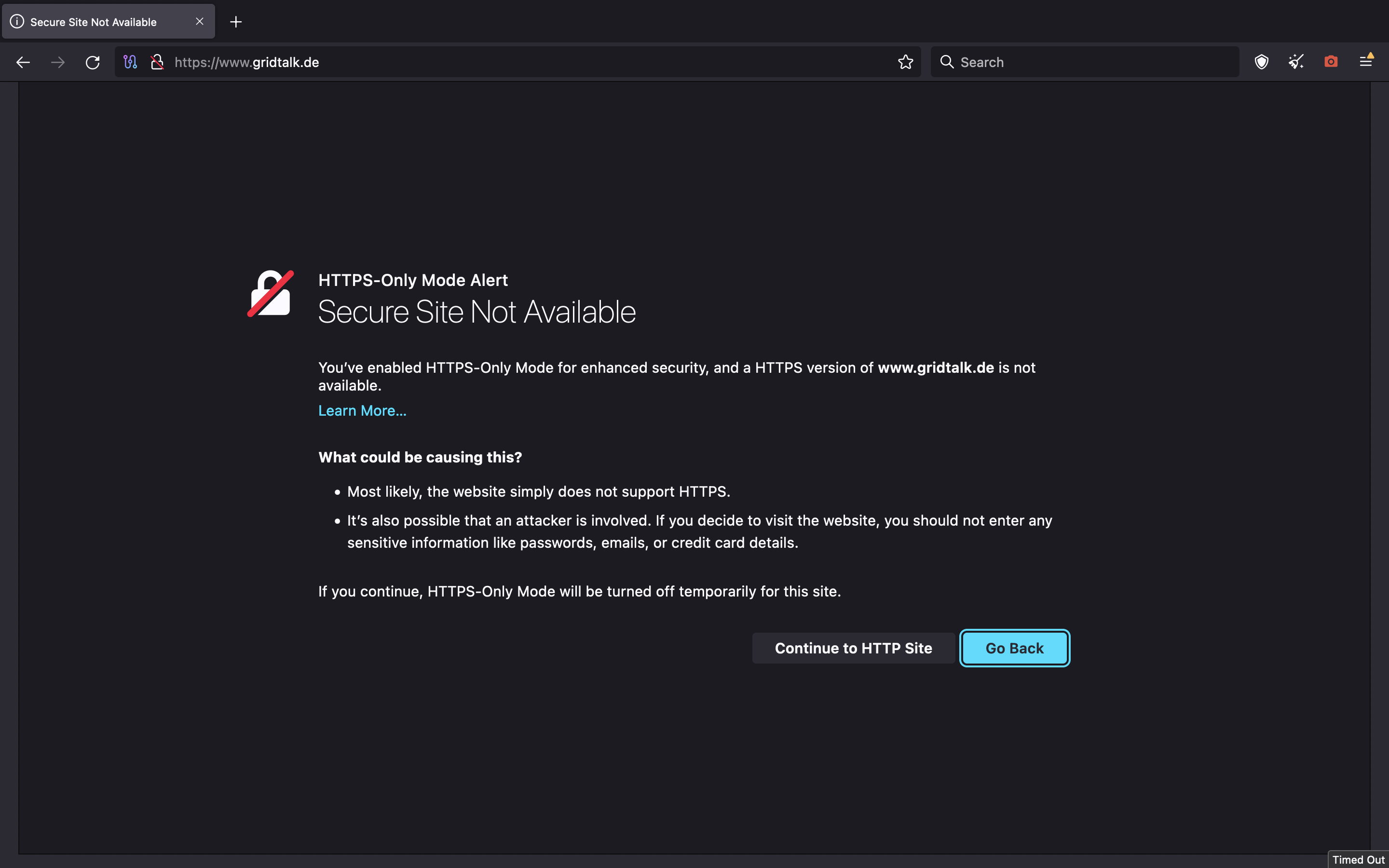 Dagegen, wenn ich Gridtalk aufrufe, sagt er mit gleich, dass die Seite nicht HTTPS sicher ist und wenn ich mich einloggen will mit Tor auf höchster Sicherheitsstufe (ohne Java scipt), dann sagt mir die Seite, dass access forbidden ist.