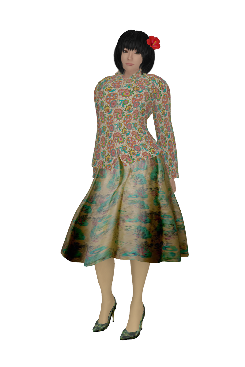 Beim Rock sind Mesh und Textur von Klara, aber von Klara selbst so nie zusammengestellt worden. Das Mesh ist einer von Klaras zwei wadenlangen Röcken von 2022, die Textur ist aus Klaras älterem Röcketextur-Vendor. Diese Kombination hat Juno selbst zusammengebaut. Sie müßte erhältlich sein in einer von Junos Röckeboxen auf Basis von Klaras Röcken. Die gibt's auch in Santiago, ebenso im jüngeren Meshmatsch-Teil auf Klaras aktueller Sim Klarakunterbunt im OSgrid und gleich nebenan im Freebie-Bereich auf Xenovar, also auch im OSgrid.
