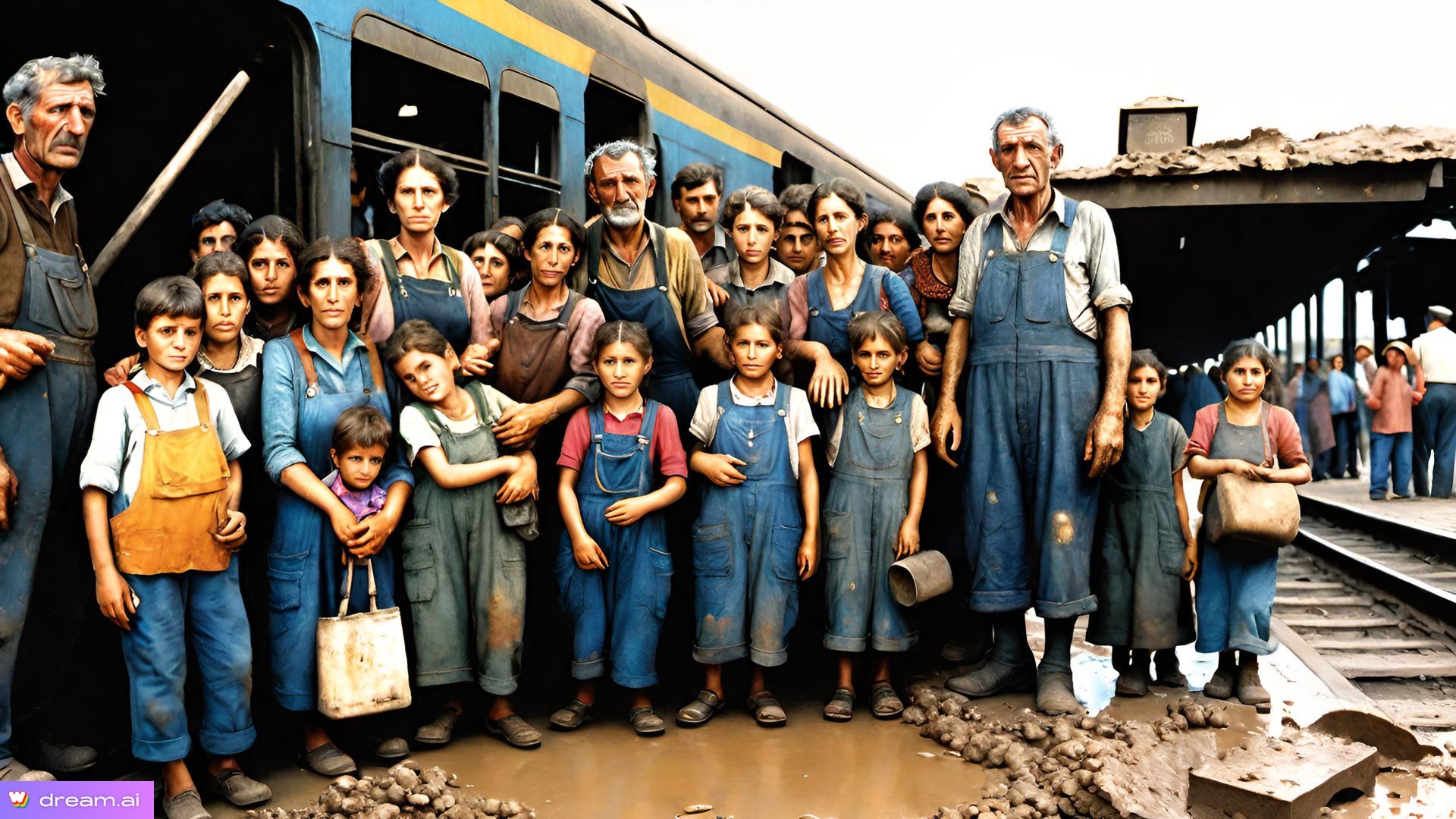 Zitat:Old HDRI photorealistic photograph with great detail, very damaged in hyperrealistic color, with torn edges, very detailed with dust, stains and scratches of 50 Spanish men in overalls covered in mud and 35 women aged 55 with children in their arms at a train station with a sign 'PAIPORTA' on both sides of the station. Each of them is anxiously looking for the train to arrive. In the background the empty train track and a destroyed Mediterranean village with palm trees. In 1945