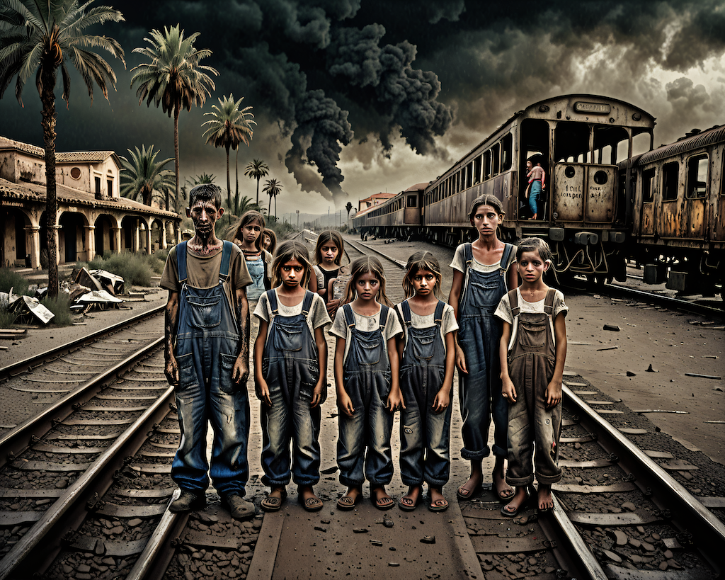 Zitat:Old HDRI photorealistic photograph with great detail, very damaged in hyperrealistic color, with torn edges, very detailed with dust, stains and scratches of 50 Spanish men in overalls covered in mud and 35 women aged 55 with children in their arms at a train station with a sign 'PAIPORTA' on both sides of the station. Each of them is anxiously looking for the train to arrive. In the background the empty train track and a destroyed Mediterranean village with palm trees. In 1945