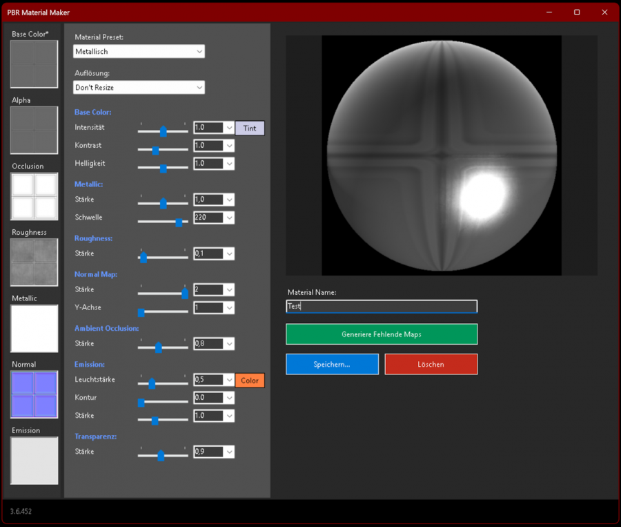 Diese Version erstellt automatisch nicht vorhandene PBR-Bestandteile (BaseColor, Normal, Occlusion, Roughness, Metallic, Emission, Alpha) und speichert sie im Zielverzeichnis. Diese werden aus der Albedo berechnet.