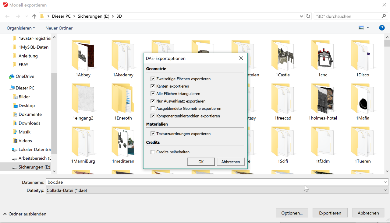 Du baust eine Box. Jetzt mit dem Versatz Werkzeug die Wandstärke auf einer Seite einstellen. Jetzt mit dem Drücken/Ziehen Werkzeug das innere nach Innen schieben. Jetzt drückst du einmal auf den Farbeimer und öffnest die Komponenten. (Ist dir das ganze zu mühselig suche einfach nach "Expo Stand" in den Komponenten.) Dort Tippst du ein „TV“ und fügst 3 TV Geräte ein. Einfügen geht einfach durch einen klick auf das Bild. Danach hast du das TV Gerät oder andere Objekte am Mauszeiger. Jetzt noch nach „Strahler“ suchen dann hast du die Lampen. So machst du das noch mit dem „TV Schrank“ und „Halter“. Jetzt noch die Schrift. Oben auf Funktionen gehen dann 3D Text. Den Text „EXCLUSIVE“ eingeben. Die Größe einstellen oder das kann man auch später noch Skalieren. Jetzt kannst du das einfärben oder mit Material versehen wie du möchtest. Jetzt musst du alle zusammen gelinkte teile entlinken. Dazu drückst du Strg + a für alles Markieren. Rechte Maustaste „In Einzelzeile auflösen“ dies machst du so oft bis nichts mehr Gruppiert ist. So nur noch Exportieren für OpenSim Alles was Exportiert werden soll Markieren oder einfach Strg + a Datei – Export – 3D Modell Auswahl Collada-Datei (*.dae) Unten auf Optionen klicken und folgende Einstellungen setzen. Info: Blender kann kein 1 Prim. Das ist so, wenn du 10 Würfel in eine Tüte schüttest hast du eine Tüte voller Würfel. Blender und OpenSim sieht aber nur die Tüte und sagt 1 Prim. Sketchup ist Windows Tastenkürzel Kompatibel das heist Kopieren, einfügen, ausschneiden, etc. Funktioniert wie bei allen anderen Windows Programmen (OpenOffice, Paint.net) auch. Auch die Maus Funktioniert wie gewohnt Links Aktionen ausführen Rechts Menü. Dazu kommt hier nur die 3. Dimension das ist die Mittlere Taste (Rad), diese festhalten und Maus bewegen dies dreht die Ansicht. Mausrad drehen Zoomt die Ansicht.