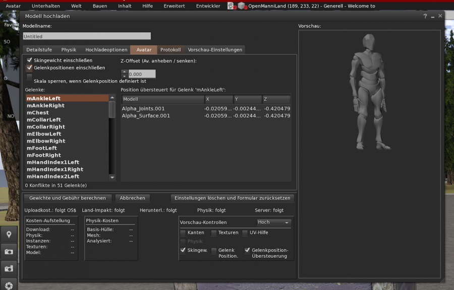 - Überprüfe Bone-Namen und -Hierarchie. Passe sie bei Bedarf an OpenSim/SL-Standards an (z.B. „mPelvis“, „mTorso“, „mHead“, etc.).